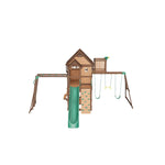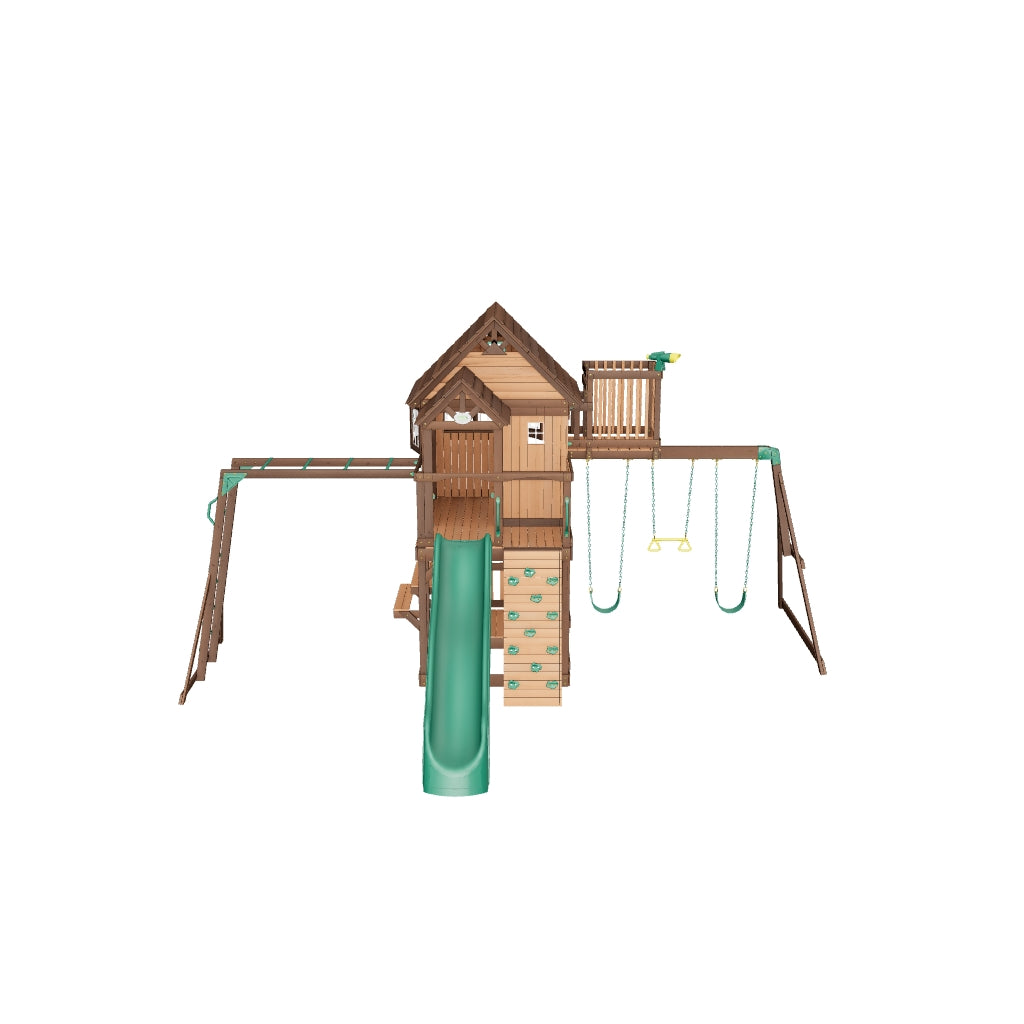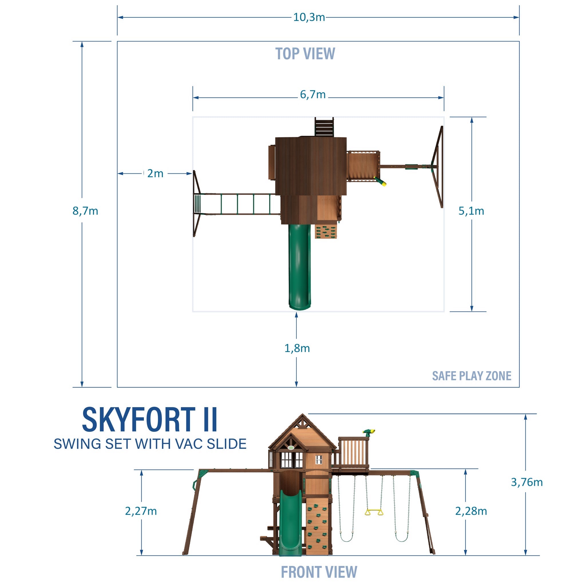 Lo Skyfort II sarà il preferito dai bambini, con il suo fortino sopraelevato, il tetto in legno, l’ingresso a timpano e il balcone. Dal punto di osservazione, scruteranno l’orizzonte con attenzione, per poi correre verso la parete da arrampicata e il parco giochi con la sua trave a tre altalene. Una solida parete da arrampicata e una scala standard offriranno un divertimento sano e attivo, mentre lo scivolo a onda di 3 metri li farà scendere velocemente per ricominciare tutto da capo!
