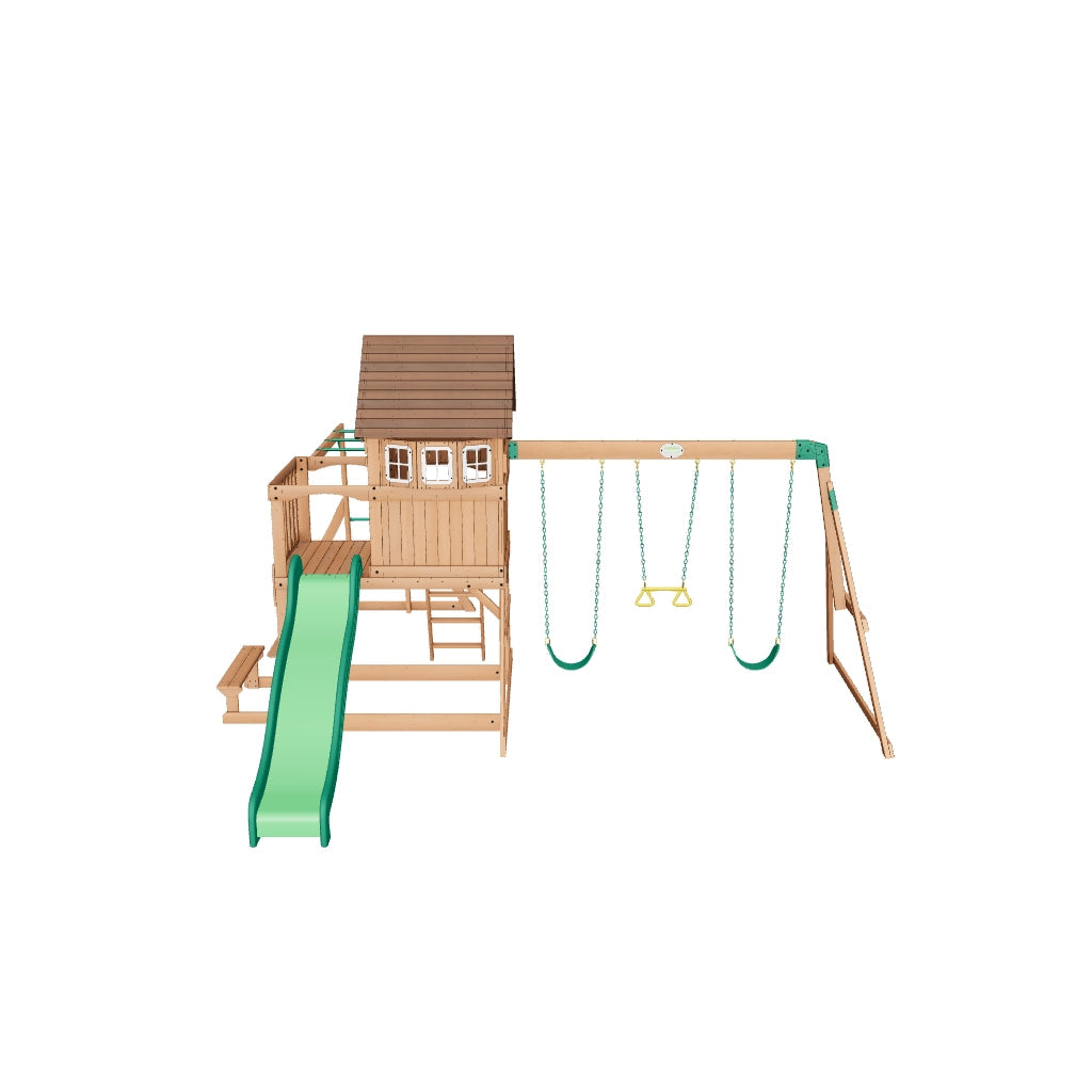 Montpelier to plac zabaw jak mała rezydencja w Twoim ogrodzie. Na górze czeka przestronny domek z dwuspadowym dachem, pełnymi drzwiami i dużymi oknami wykuszowymi, w których dzieci mogą bawić się w dom albo w pałac. Przedni balkon służy jako dodatkowy taras i miejsce startu dla superszybkiej zjeżdżalni o długości 2,5 m. Małpi gaj i drabinka prowadzą prosto na górny poziom, zachęcając do wspinania i ruchu.