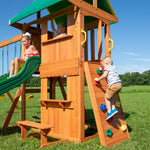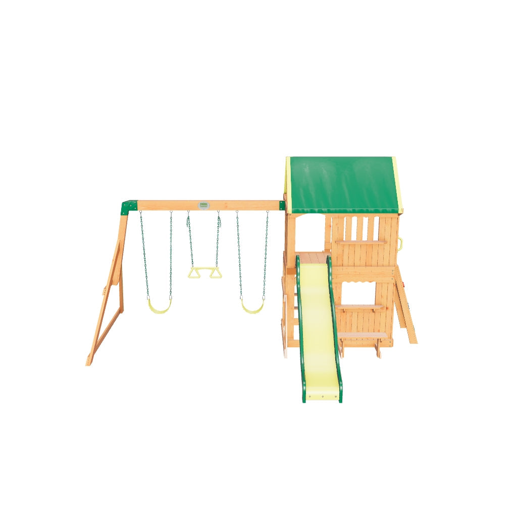 Plac zabaw Somerset to świetne rozwiązanie do mniejszych ogrodów, ale bez rezygnowania z frajdy. Szeroki domek z górną ścianką i okienkiem obserwacyjnym daje dzieciom poczucie własnej bazy. Na dole czeka okienko barowe z ławką, idealne na zabawę w sklep lub dom. Solidna ścianka wspinaczkowa zachęca do ruchu, a tylna drabinka pozwala łatwo wejść na górny podest. Szybka zjeżdżalnia gwarantuje zjazdy pełne śmiechu. Na belce huśtawek wiszą dwie huśtawki oraz drążek akrobatyczny dla małych odważnych. Kiedy dzieci zmęczą się huśtaniem i zjeżdżaniem, mogą usiąść przy stoliku piknikowym i chwilę odpocząć.