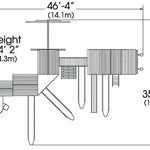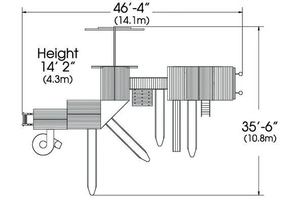 This play structure also includes wooden roofs, a playhouse, an upper loft, a triangle bridge, an adventure bridge, a cabin module, a lower cottage area, a porch and a lemonade stand. It also features eight dormers, a three position swing beam of approximately 274 cm, two belt swings, a trapeze bar, a spiral tube slide of approximately 274 cm, two rocket slides of approximately 427 cm and two rocket slides of approximately 366 cm. Additional elements include monkey bars, a monkey bar fireman pole, a rock climbing wall of approximately 183 cm, a picnic table, a tire swivel swing, a gang plank, a ship wheel, a steering wheel, binoculars and a telescope.