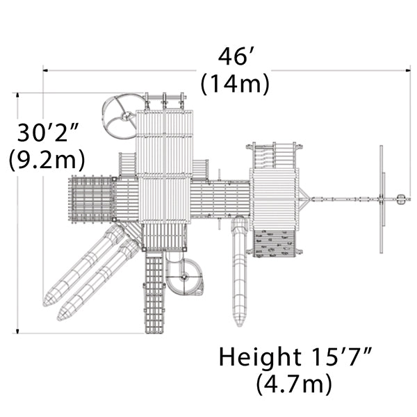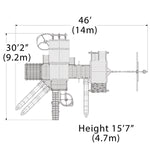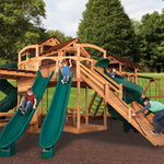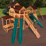 This masterpiece features both Treehouse and Peak-style forts, connected by an adventure bridge and wrapped in a charming wooden porch. With multiple slides, monkey bars, a spiral tube, and a cozy kitchenette, every inch is made to amaze.